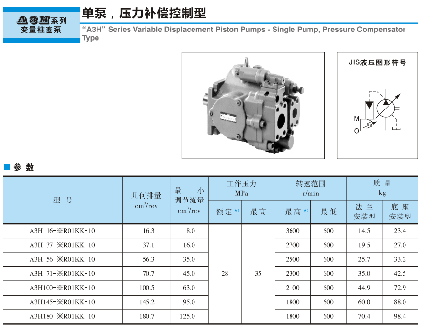 油研A3H系列高壓變量柱塞泵的主要工作參數包括: