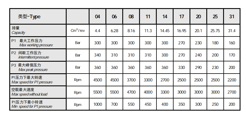 - 容量從 4 到 31cc/rpm – 0.244 到 1.891 cu in/rpm;