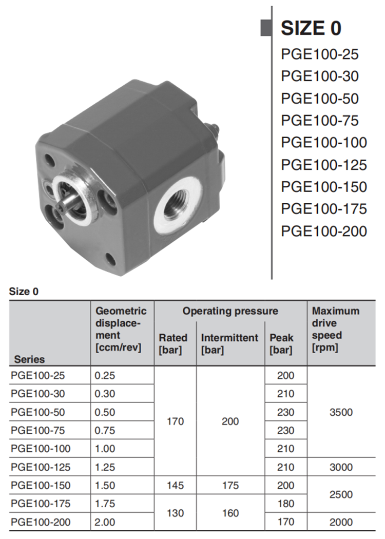 PGE100 是我們用于開環液壓系統的外嚙合齒輪泵的 0 號尺寸。