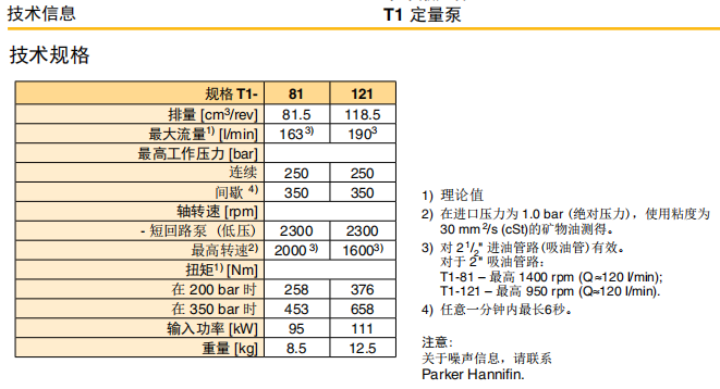 派克 T1 泵有 T1-81 和 T1-121 可供選擇——詳情請參見規格標簽。