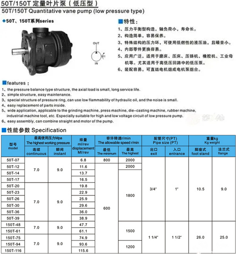 油研50T/150T系列葉片泵具備高壓高性能的特點,能夠滿足各種復雜工況下的動力需求。無論是高低壓回路中的低壓泵使用,還是作為增壓泵在高壓系統中運行,該系列泵都能表現出色。其寬廣的流量范圍和穩定的性能使得油研葉片泵在注塑機、中空成型機、壓鑄機等塑膠機械行業中得到了廣泛應用。