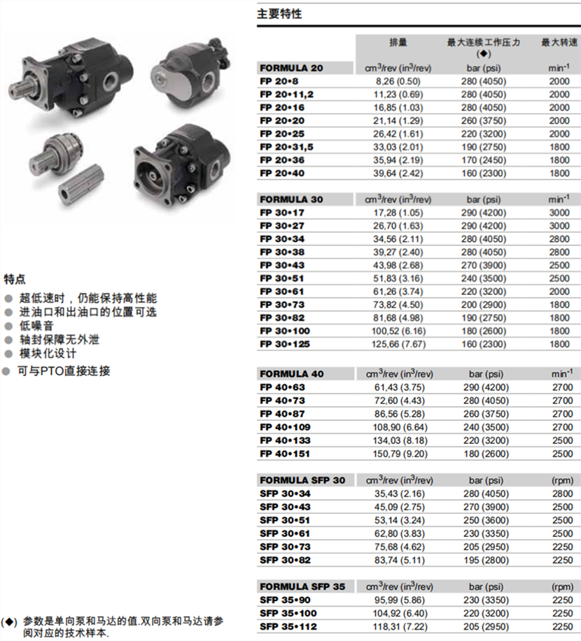 排量范圍:從8,26 cm3/rev (0.50 in3/rev) 到150,79 cm3/rev (9.20 in3/rev);分20, 30, 35和40四個規格。