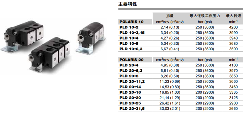 排量范圍:從2,14 cm3/rev (0.13 in3/rev) 到33,03 cm3/rev (2.01 in3/rev);分10, 20兩個規格。