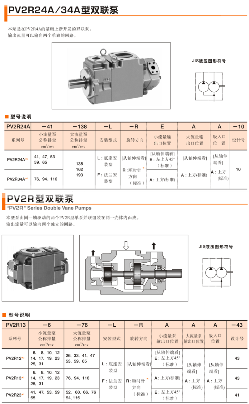 1.YUKEN油研S-PV2R系列葉片泵由兩個獨立的低噪音單級葉片泵串聯組裝在一個泵體內,共用一個驅動軸。
