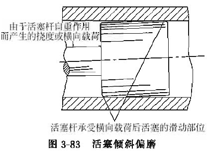 1、活塞與缸孔間隙太大。若活塞與缸筒內孔配合間隙太大,在長度很大的活塞桿自重作用下, 活塞桿撓曲,或者即使活塞桿不撓曲,但由于自重,產生的彎曲力矩若大于活塞的傾覆力矩時, 則活塞將處于傾斜姿勢沿缸壁運動而發生偏磨, 如圖3-83所示。